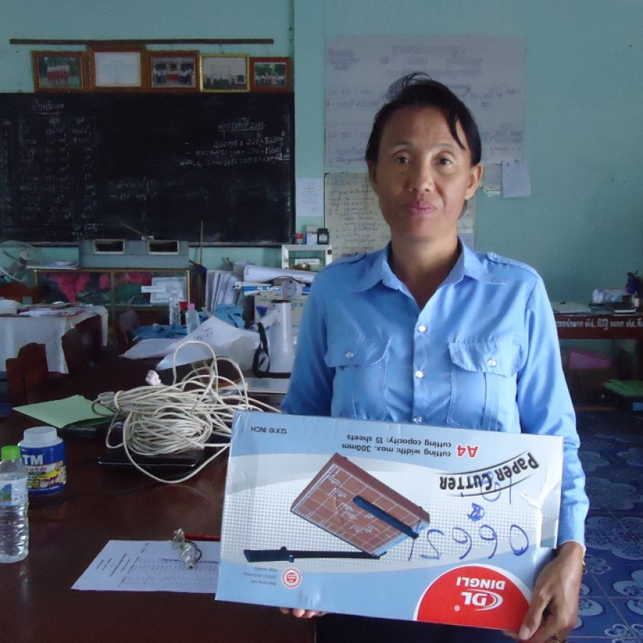 This is the Principal of Koy Meng Secondary School. A small donation from Growing Cambodia goes a long way – the school had wanted a Paper Cutter for a long time but lacked the funds until now.